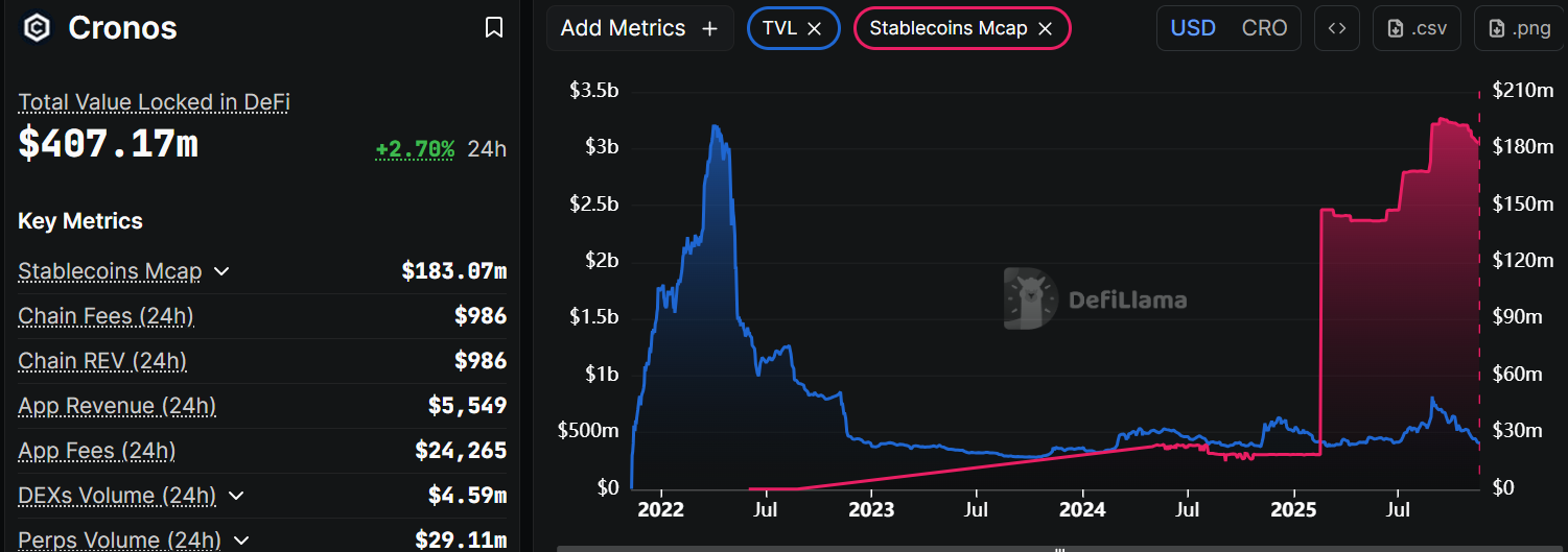 According to DeFiLlama statistics, on-chain Cronos adoption is gaining momentum. The retail demand has increased by 2.70% to place Cronos at a TVL of $407.17 million. It also indicates positive confidence in the Cronos digital assets, as it is receiving inflows, and the capitalization of the stablecoin market is more than $183 million. This shows a substantial increase from the $18.39 million on January 1, which is an indication of good liquidity.