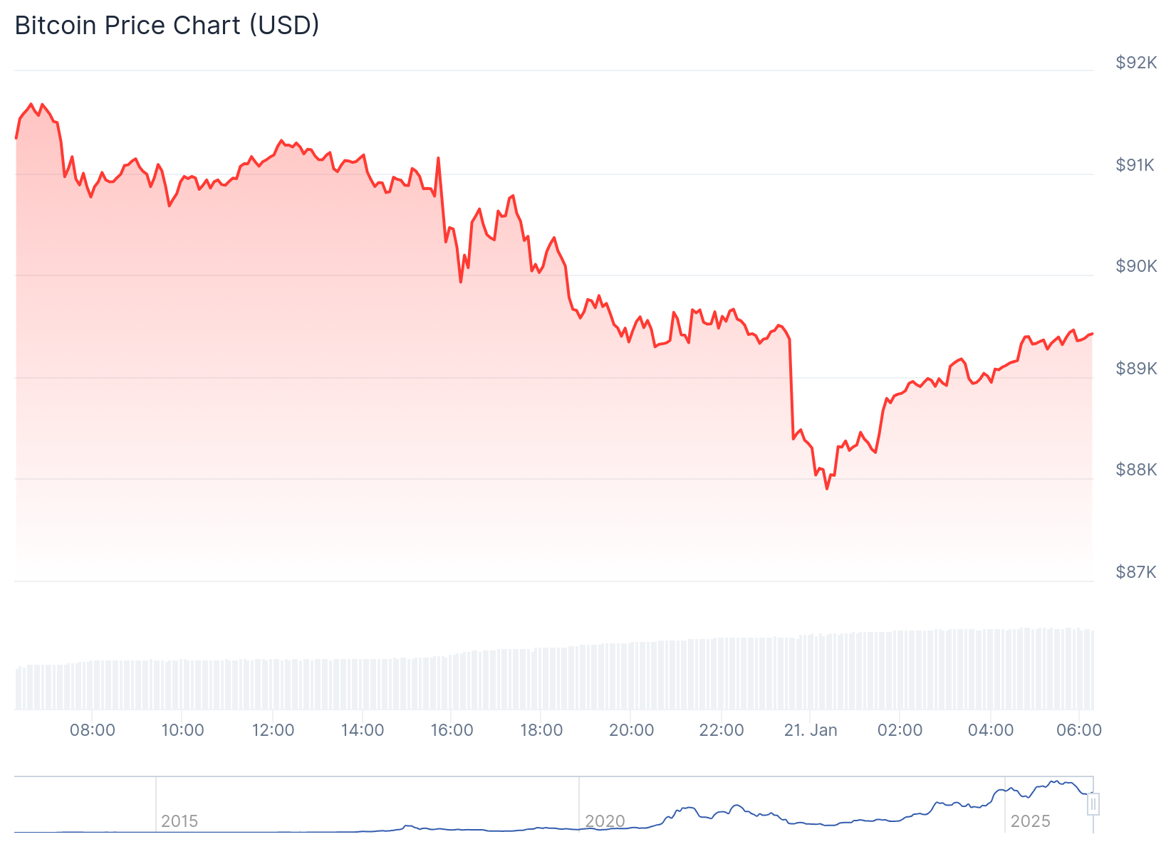 At the time of writing, the cryptocurrency market is 2.7% down in the past 24 hours, with a market cap of $3.12 trillion and a trading volume of $159.25 billion. Within the same timeframe, Bitcoin dropped 2.1%, trading at $89,464, with a market capitalization of $1.79 trillion and a trading volume of $61.9 billion. The asset is also down 6% 7-day-to-date, 3.6% 14-day-to-date, and 13.1% year to date.