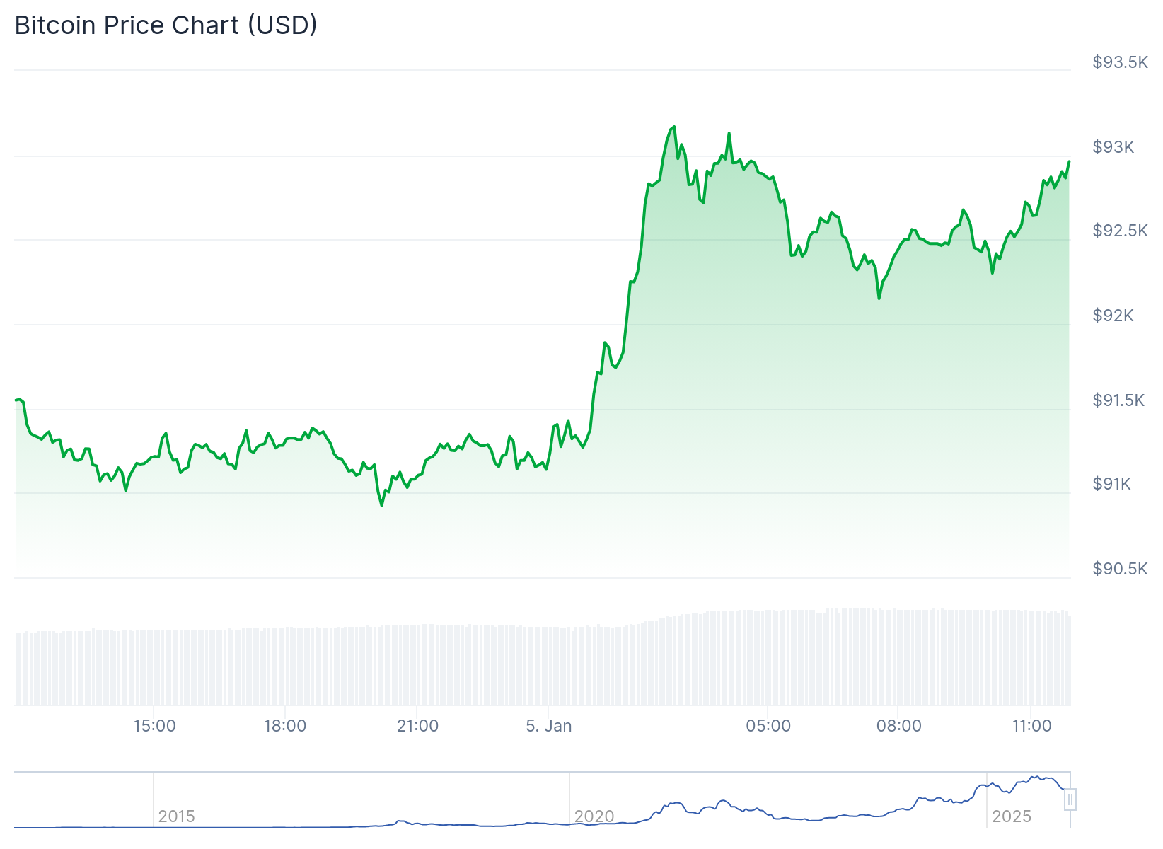 At the time of writing, the crypto market is 1.1% up in the past 24 hours with a market cap of $3.248 trillion and a trading volume of approximately $101.645 billion. Bitcoin’s dominance sits at 57.2%, while Ethereum’s dominance is at 11.8%. Like the broader crypto market, BTC is priced at $93,056 following a slight 1.5% upswing. It has a market cap of $1.86 trillion and a trading volume of $37.29 billion. Volatility remains low at 1.74% with a bearish sentiment.