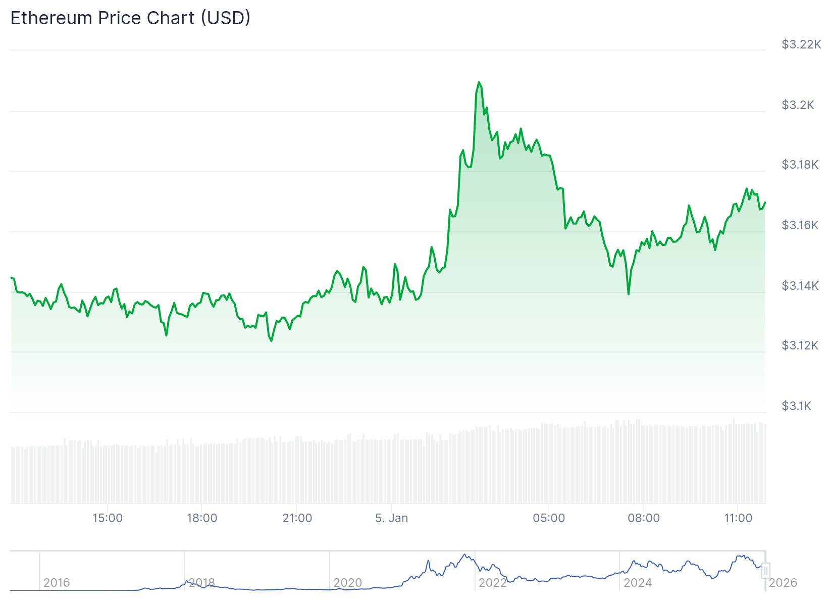 Similarly, Ethereum is changing hands at $3,172, following a slight 0.8% spike in the past 24 hours, with a market cap of $382.65 billion and a trading volume of $17.1 billion. ETH’s 7-day-to-date and month-to-date price change variables show spikes of about 5.3% and 4.6%, respectively. However, the asset dropped 12.4% year-to-date. Sentiment remains bearish, while the “Fear & Greed Index” points towards “Fear” at 26.