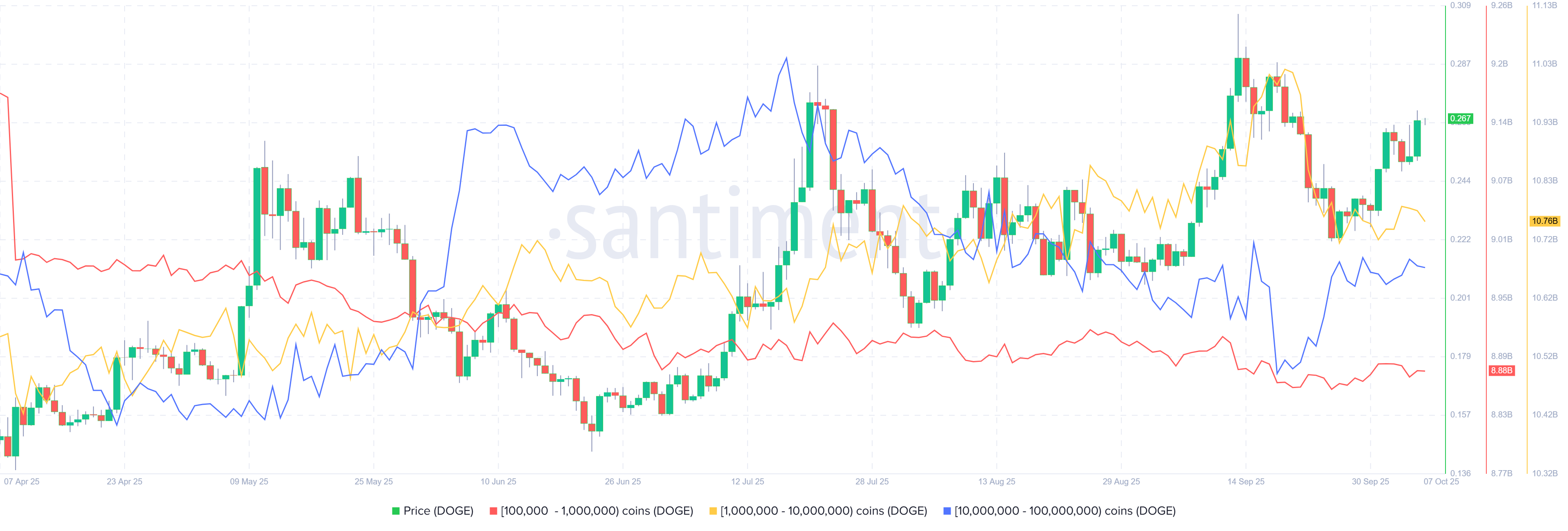 On the other hand, Dogecoin’s bullish outlook is supported by Santiment’s Supply Distribution data. According to the metric, the whales holding 100,000 to 1 million (red line) and those holding 10 million to 100 million (blue line) have accumulated 390 million tokens since September 23. During the same period, the wallets holding 1 million to 10 million DOGE tokens (yellow line) have shed approximately 10 million tokens.