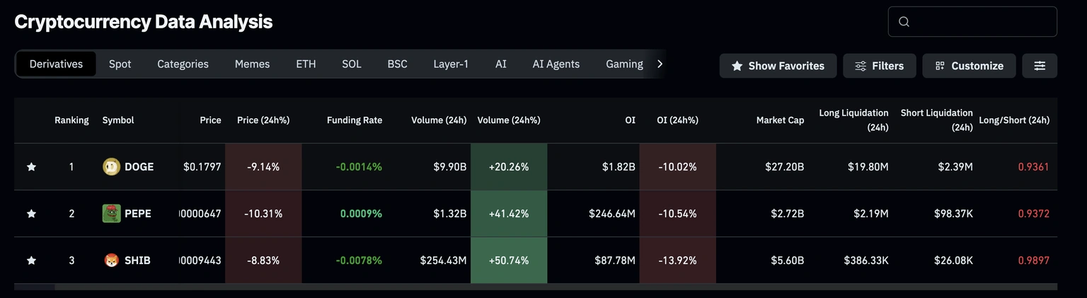 The Dogecoin price is at a deeper correction, plummeting 6% to $0.179. Despite the drop, its daily trading volume has increased 32% indicating that the investor confidence is creeping back. The past three days’ pullback has precipitated the top meme coins, with support levels becoming lines in the sand. DOGE, SHIB, MemeCore, and PEPE are technically in the make-or-break stage, whereas almost $1 billion in cumulative liquidations in the crypto market is an indicator of a bearish trend.