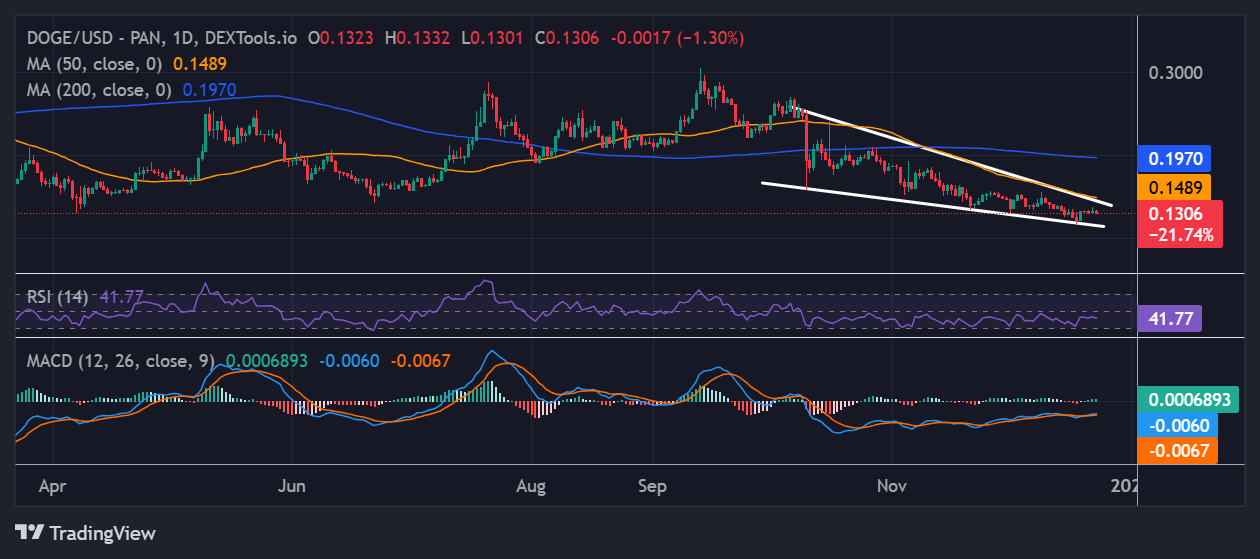 - The Dogecoin price has steadied at $0.13, as bulls eye a potential breakout above the falling wedge pattern.