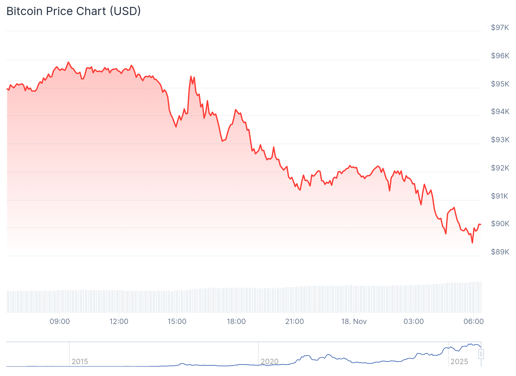 At the time of press, the crypto market is 4.2% down in the past 24 hours with a trading volume of $240.002 billion and a market cap of roughly $3.18 trillion. Within the same timeframe, Bitcoin dropped 5.1%, trading at $90,107 with a market cap of $1.798 trillion and a trading volume of approximately $110.95 billion.