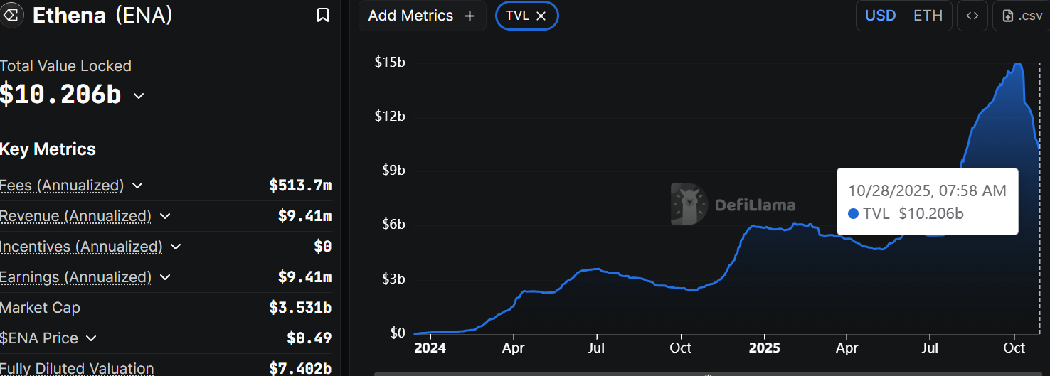 The Ethena price(ENA) has been experiencing a difficult time in the market, and the interest level and the volume of trading have declined significantly. On October 28, 2025, the Total Value Locked (TVL) of Ethena stands at $10.206 billion, a significant decline from $14.818 billion on October 10.