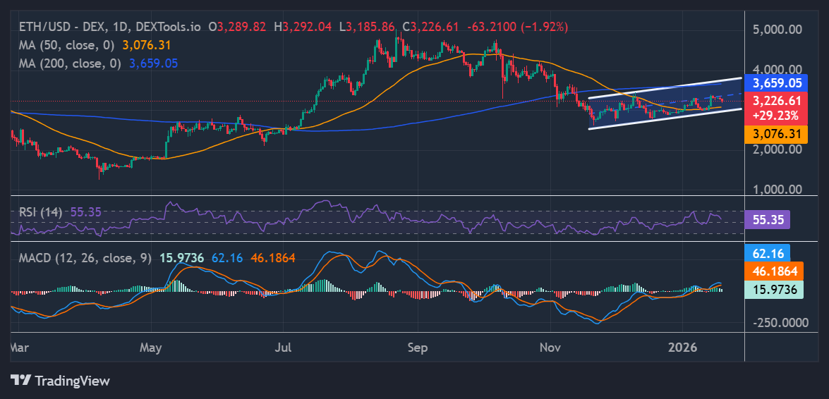 The altcoin is currently trading within a rising parallel channel, as the Ethereum price eyes a bullish breakout as the $3,076 support level holds. This area saw strong buying interest and could attract new buyers if prices stabilize.