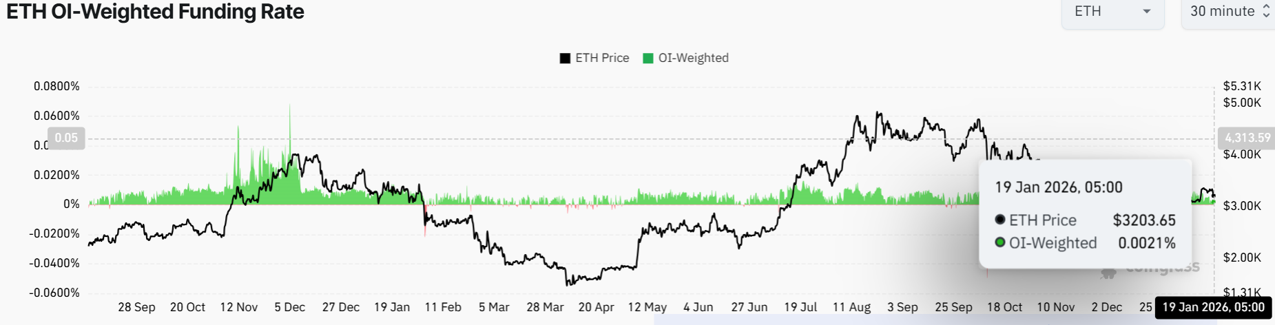 According to data from Coinglass, the OI-Weighted Funding Rate shows that the number of traders betting on a fall in ETH’s price is lower than those betting on a rise.