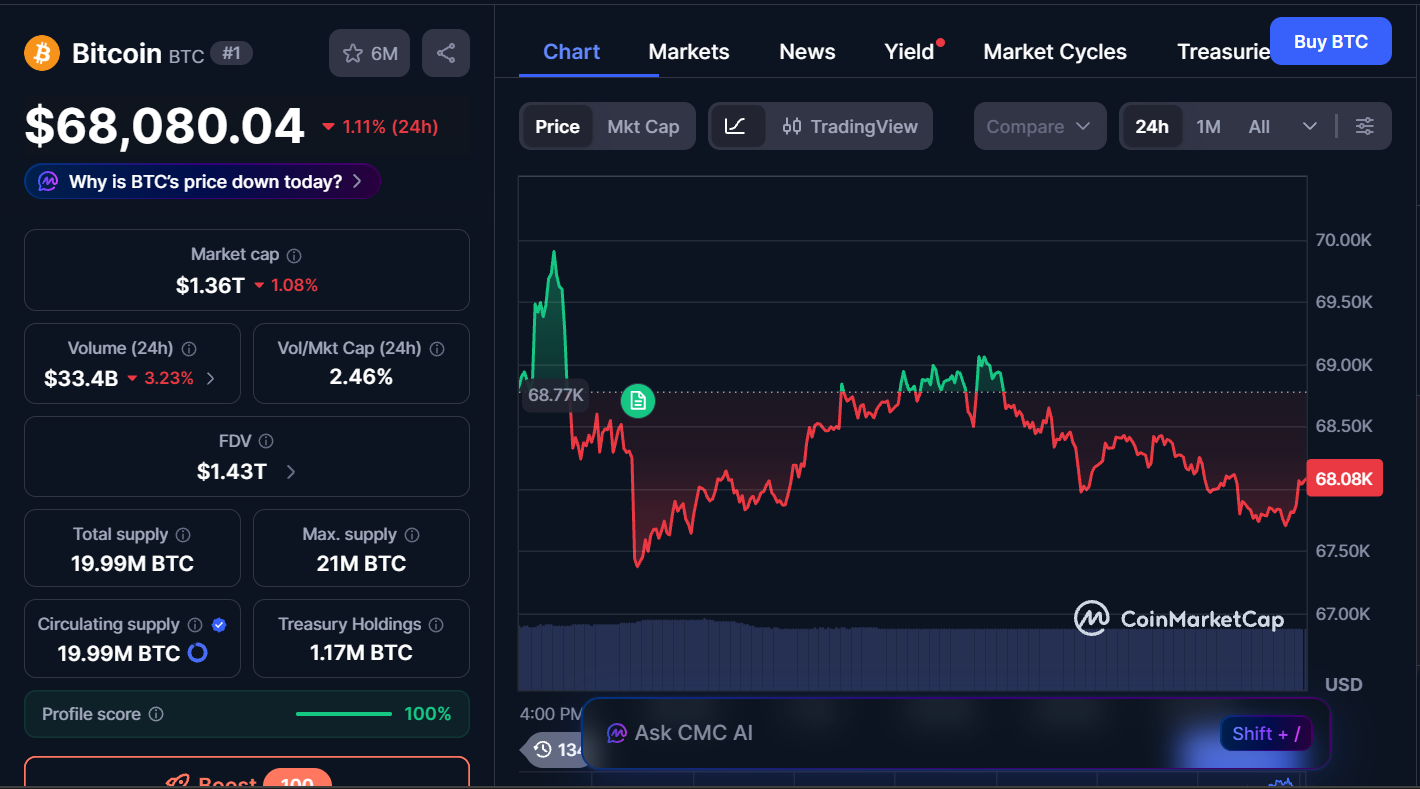 The BTC price fell 1.11% in the past 24 hours, with the price currently trading at $68,080. In addition, the trading volume is down 3.23% to $33.4 billion, while the market cap stands at $1.36 trillion.