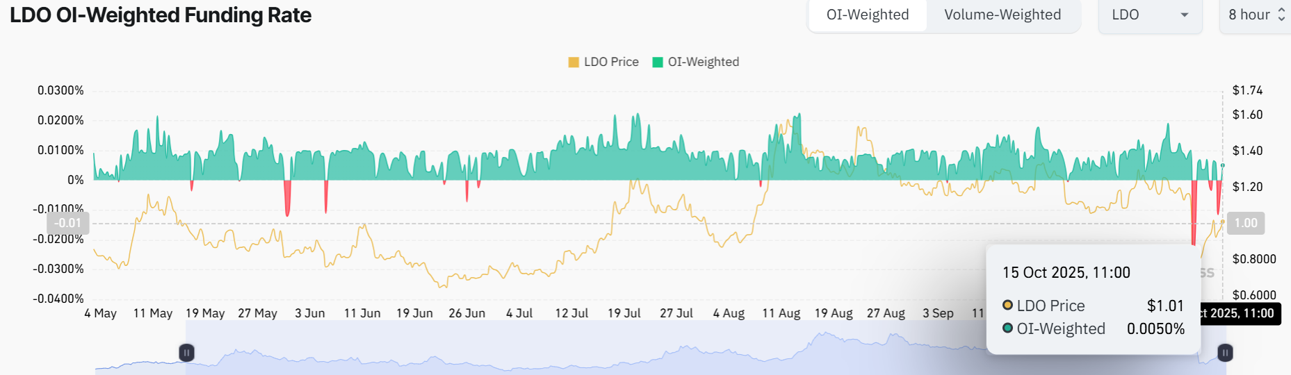 The data on the on-chain metrics, CoinGlass, indicates that the LDO OI-weighted funding has regained its position, with an average of 0.0050% at the time of writing. As sentiment turns positive, it implies that traders are piling into long positions, anticipating that the Lido DAO price will rise past $1.16 resistance.