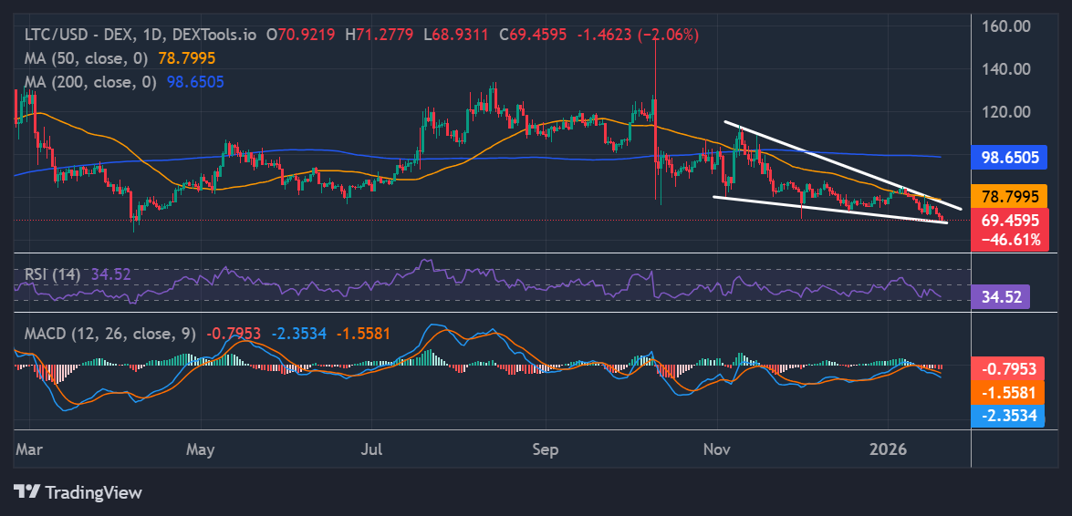 Litecoin (LTC) is trading below $70 at $69, down 8% over the past week. The pessimistic mood is reinforced by whales selling LTC, which puts pressure on sellers. Technically, momentum indicators show weakness, indicating an additional correction in the coming days.