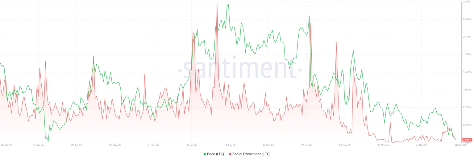 - Santiment data shows that whales are offloading LTC as social dominance declines.