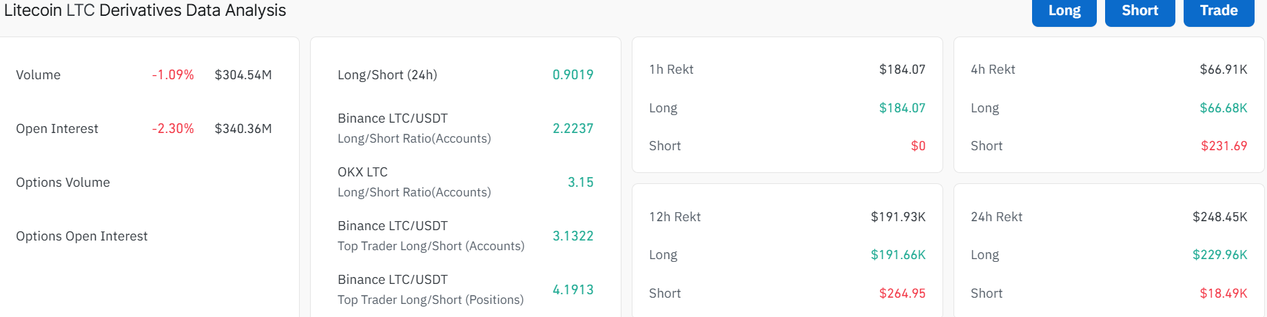 - The LTC derivatives data show weakening retail demand, as the open interest slips by 2%.