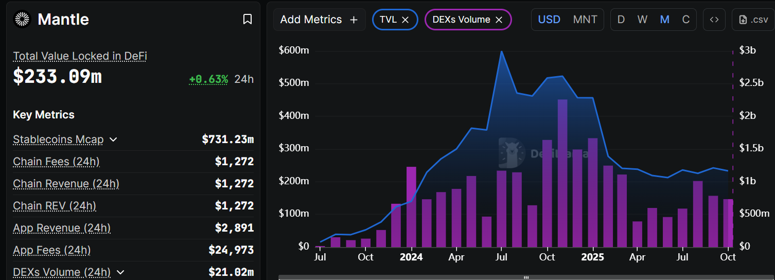 According to DeFiLlama data, the Mantle has already assembled $732.48 million in monthly DEX volume, marking the third consecutive month it has launched over $700 million. In a volatile market, demand remains stable even though the DEX volume reduced to $1 billion in August.