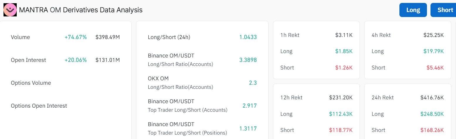Recently, the trading volume and the open interest of the OM (Mantra) derivatives market have demonstrated extraordinary growth. Mantra price volume has soared 250% to $634.38 million, and the open interest has increased by 66.42% to $57.09 million.