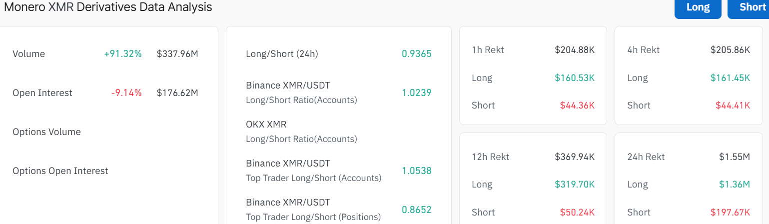 The retail strength of Monero sends mixed signals, as it shows good rates of funding despite XMR futures Open Interest (OI) decreasing and huge long liquidations. According to CoinGlass, the XMR OI has reduced by 9.14% in the past 24 hours, to $176.62 million. This indicates that the value of the outstanding contracts has decreased.