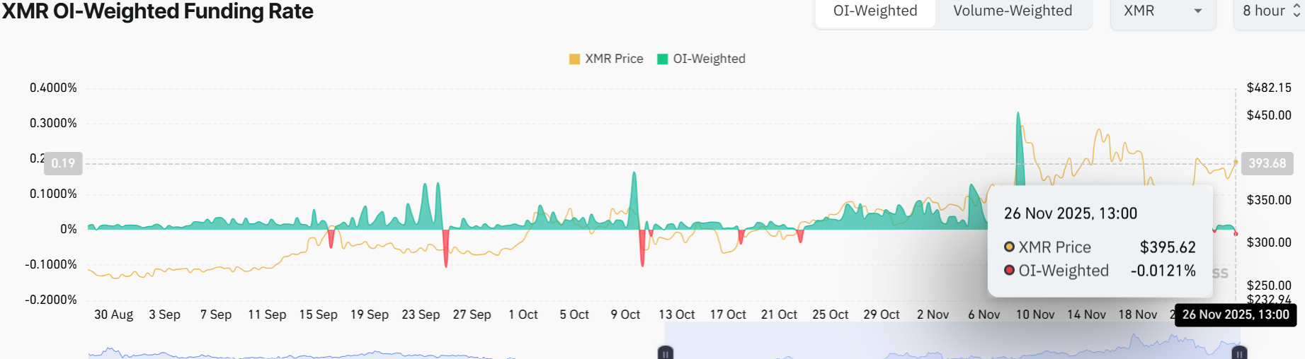 This indicates that traders are in a positive mood and are hopeful for a recovery in the Monero price. Notably, the volume has risen 19% to $90.13 million, indicating intense trading activity among traders. However, the OI-weighted funding rate is at a negative value of -0.0121%. This means that buyers still mind short-term positions. Furthermore, this may lead to the XMR price entering a consolidation phase before a potential rise.