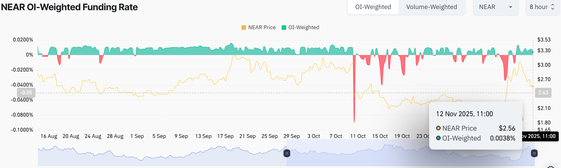 The NEAR Protocol price has rebounded above the key support zone, currently trading at $2.65. This indicates that the bulls are ready to recover after a slight downside over the past few days. However, the daily trading volume is still in the red, down 27%, indicating a drop in trading activity. Moreover, rising TVL and strong funding rates signal a more bullish market mood. This further suggests that the NEAR price is poised for a recovery soon.