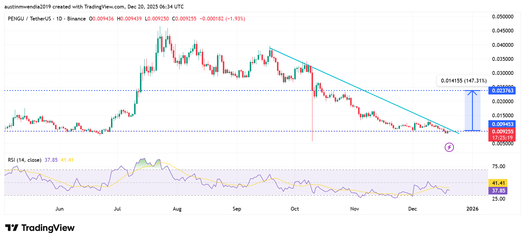 A strong support sits near $0.0090, which continues to hold despite repeated tests. Below that, $0.0075 remains the last major defense. Meanwhile, the resistance aligns near $0.0237, which capped previous rebounds. To add to the bullish momentum, the RSI is rising from weak levels, which suggests improving momentum. If strength persists, PENGU could target an advance toward $0.016 in the upcoming bull cycle.