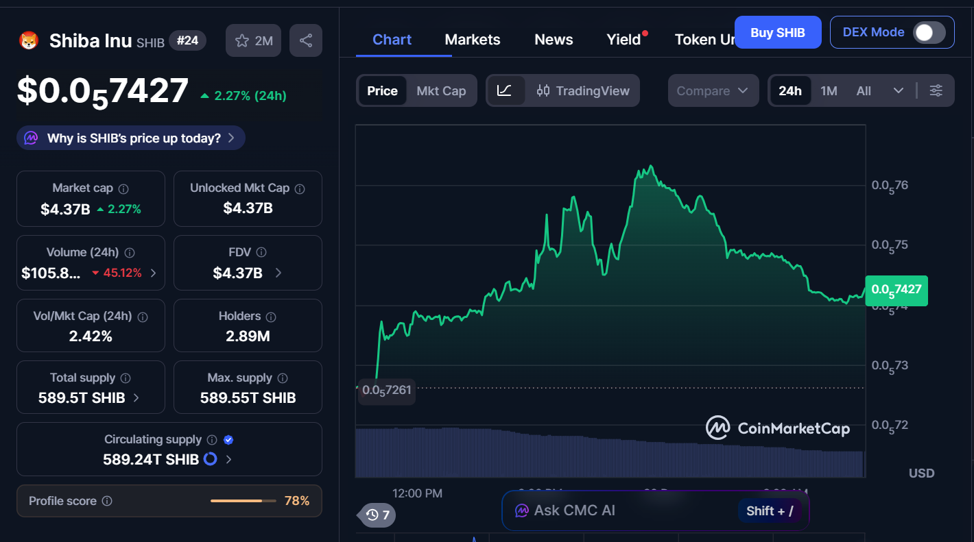 SHIB is trading at $0.000007427, a 2.27% increase in the past day. However, the trading volume has decreased 45.12% to $105.8 million. Meanwhile, the market cap of the memecoin stands at $4.37 billion.