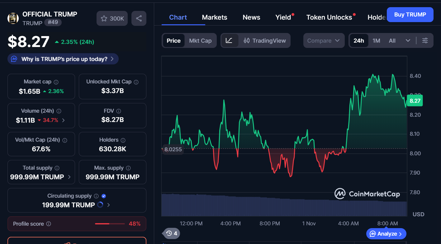 Trump Coin is leading the memecoin market recovery with a 2.35% rise to $8.27 in the past 24 hours. The market cap stands at $1.65 billion. However, the trading volume is down 34.7% to $1.11 billion.