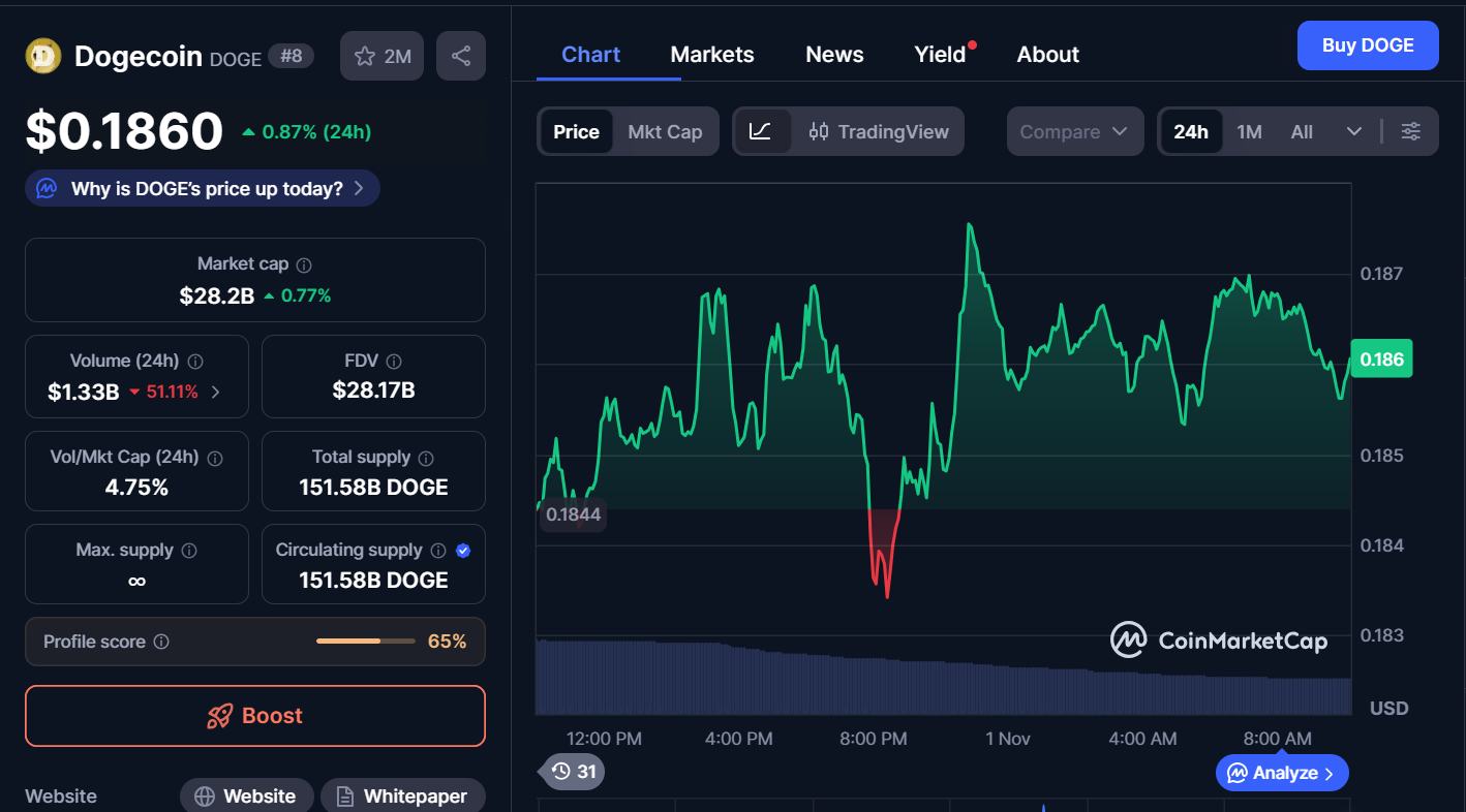 The largest memecoin by market cap is trading at $0.1860, a 0.87% increase in the past day. However, the trading volume is down 51.11% to $1.33 billion. Meanwhile, the market cap stands at $28.2 billion.