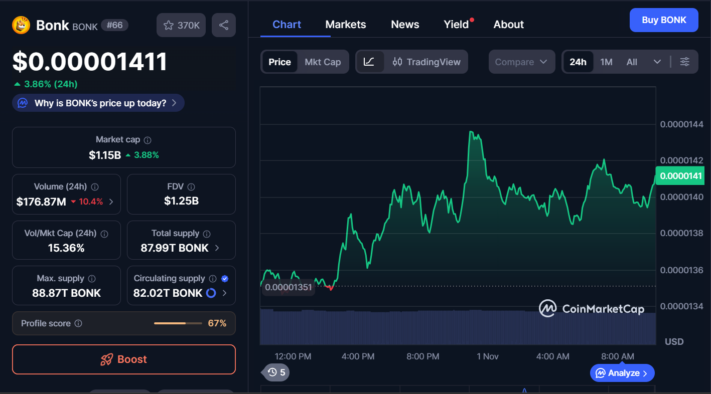 BONK, a Solana-based memecoin, is trading at $0.00001411, representing a 3.86% increase over the last 24 hours. The market cap stands at $1.15 billion, while the trading volume has decreased by 10.4% to $176.87 million.