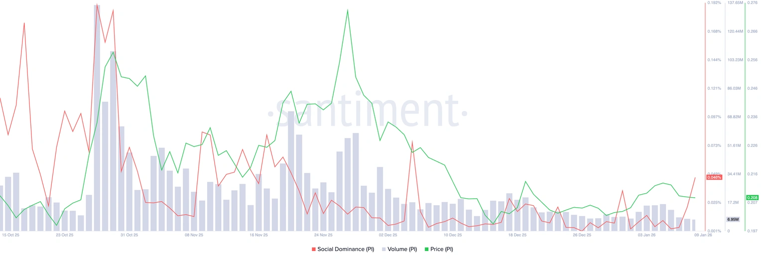 - On-chain metrics show a rise in Social dominance, which may drive the recovery of Pi Coin price.