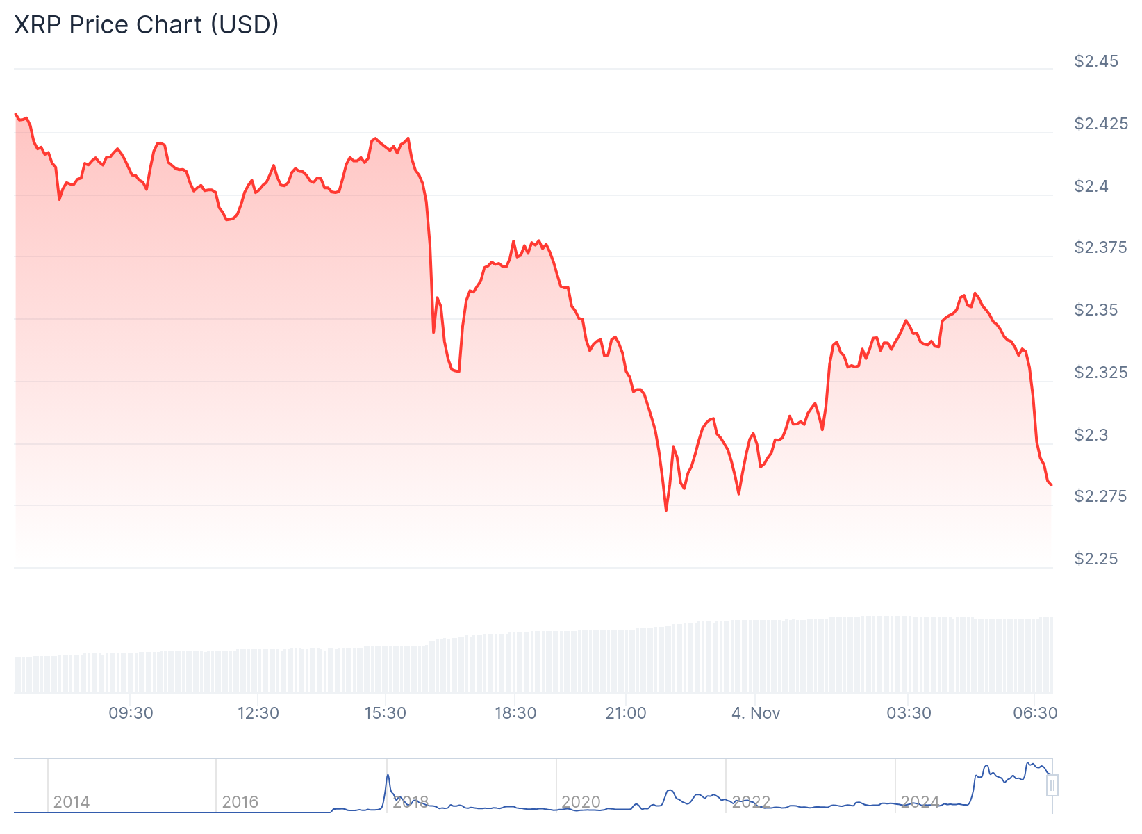 At the time of writing, Ripple’s native token, XRP, is priced at $2.32, following a 4.8% decline in the past 24 hours. Despite the price drop, XRP’s 24-hour trading volume surged 104.35%, to reach $6.51 billion. Meanwhile, XRP’s sentiment remains bearish, while supply inflation and volatility are high at 6.26% and 7.35%, respectively.