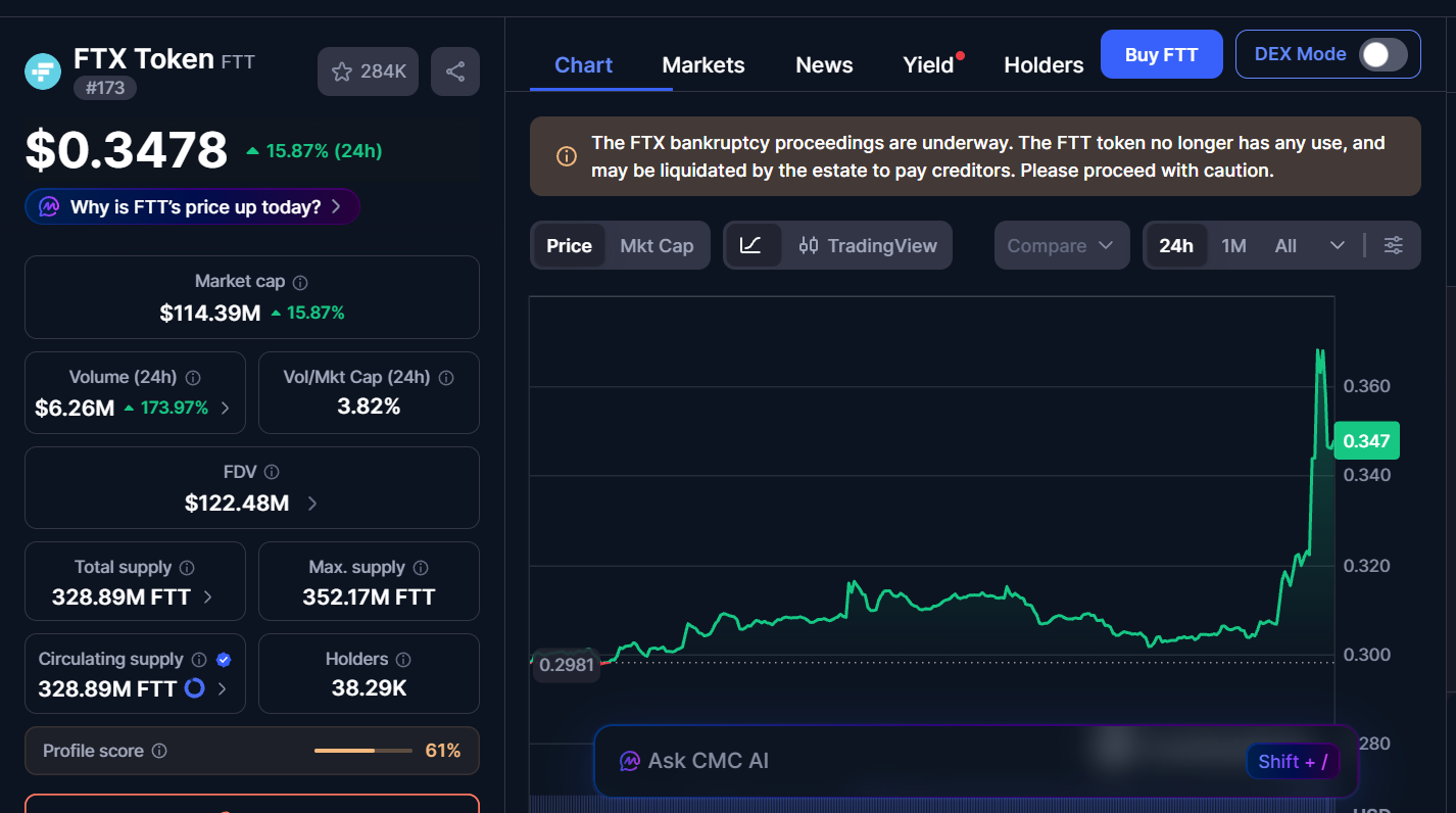 After the exchange, the FTT token recorded a brief speculative movement. The coin is trading at $0.3478, a 15.87% increase in the past day. The trading volume is up 173.97% to $6.26 million, while the market cap stands at $114.39 million.