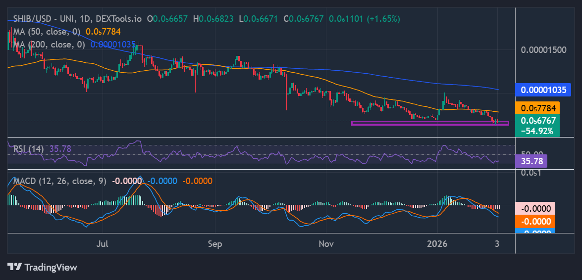 The RSI is currently around 35.78, which is below the neutral 50 level but above deep oversold conditions. This indicates bearish momentum is weakening. Additionally, RSI has started to flatten and is slightly upward, often an early signal that selling pressure may be fading. On the other hand, the MACD has plunged below the signal line, indicating intense selling pressure. Its move into the negative territory further reinforces the bearish sentiment in the SHIB market.