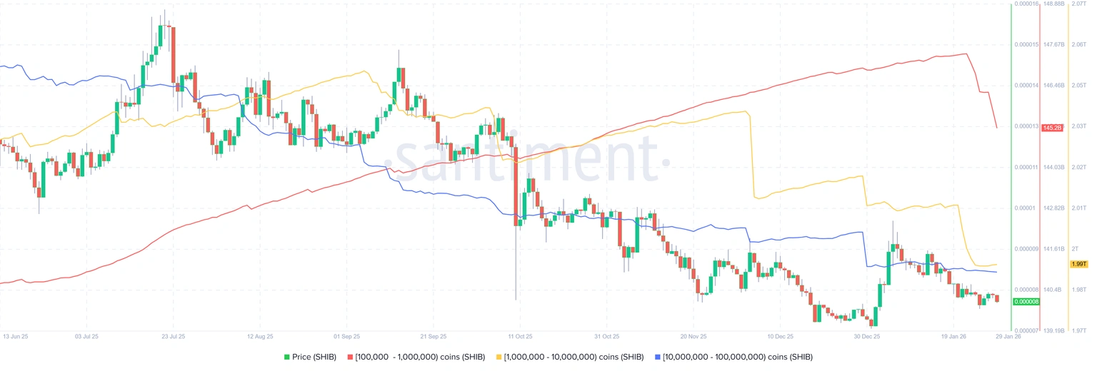 Santiment Supply Distribution shows that the large-wallet holders of Shiba Inu are on a downward trend, and it is a bearish sign. The measure shows that the whales with the number of 100,000 to 1 million (red line), 1 million to 10 million (yellow line), and 10 million to 100 million (blue line) have lost a total of 32.17 billion SHIB tokens. This is between January 20 and Thursday, which has added to the selling pressure.