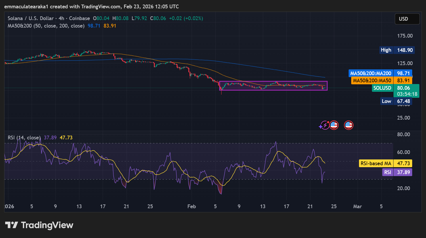The SOL/USD 4-hour chart shows the altcoin price action trading below the 50-day Simple Moving Average at $83, signaling a bearish tone. Further, the 200-day SMA at $98 is acting as a long-term barrier, which is cushioning the bulls against any upside movement. The latest drop has seen a massive volume spike by about 80%, indicating panic selling in the SOL market.