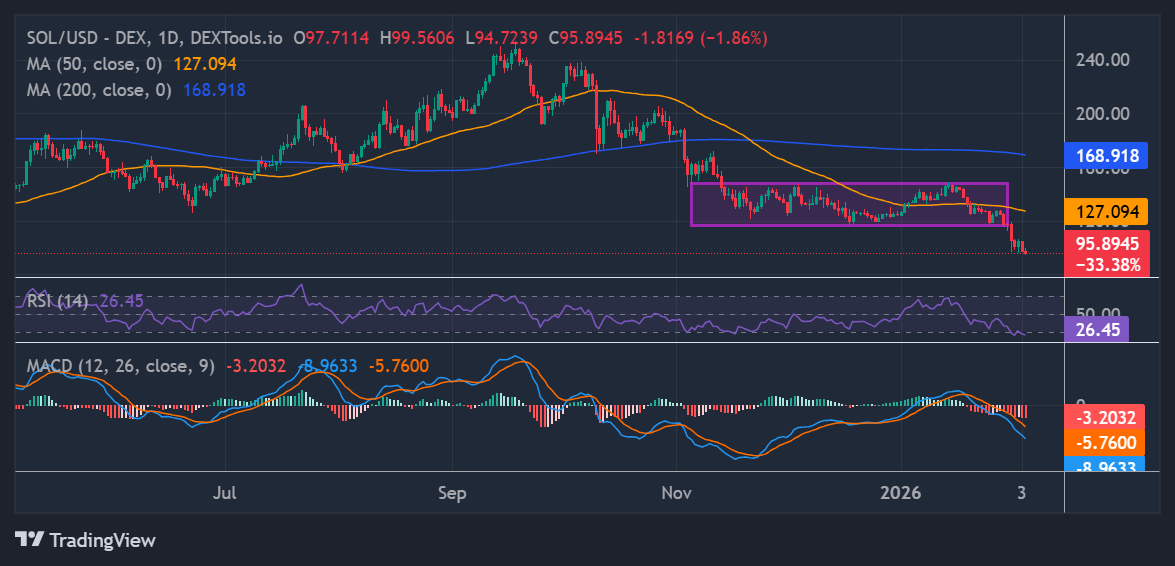 Solana price has been in a steady downtrend and is currently trading at $96. The altcoin broke down from important support near $127, with sellers quickly pushing the price through the consolidation channel, with the 200-day Simple Moving Average (SMA) and the 50-day SMA, both turning into resistance.