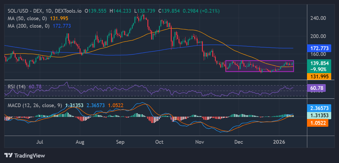 Price action for Solana indicates growing bullish strength, with the price trading at $139. Right now, SOL trades above its 50-day simple moving average (SMA) at $131, which serves as critical support for buyers. The long-term 200-day SMA is above the price at $172, so bulls must break through this zone to ignite a bullish trend.