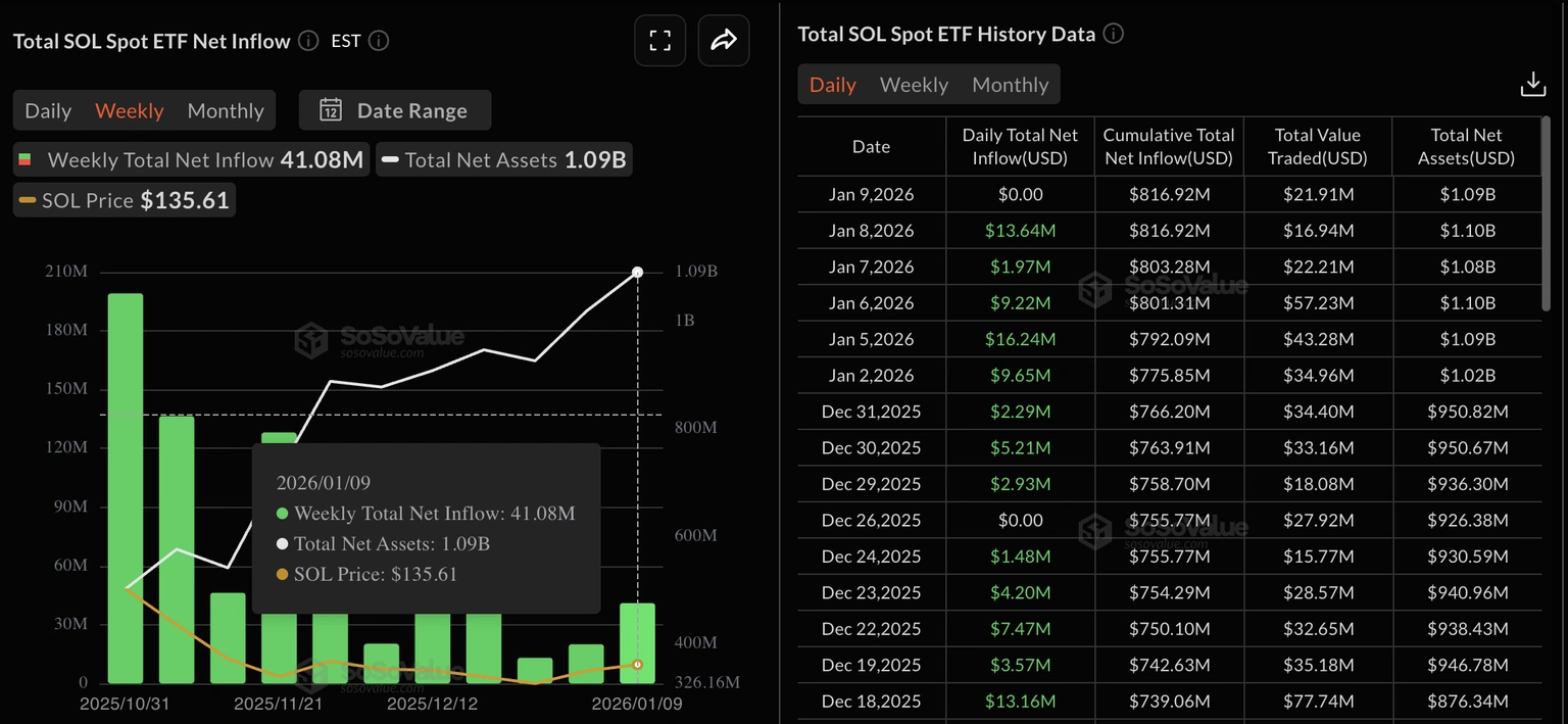 - The SOL Spot ETFs have recorded more than $41 million in total inflows over the past week, indicating renewed investor demand.