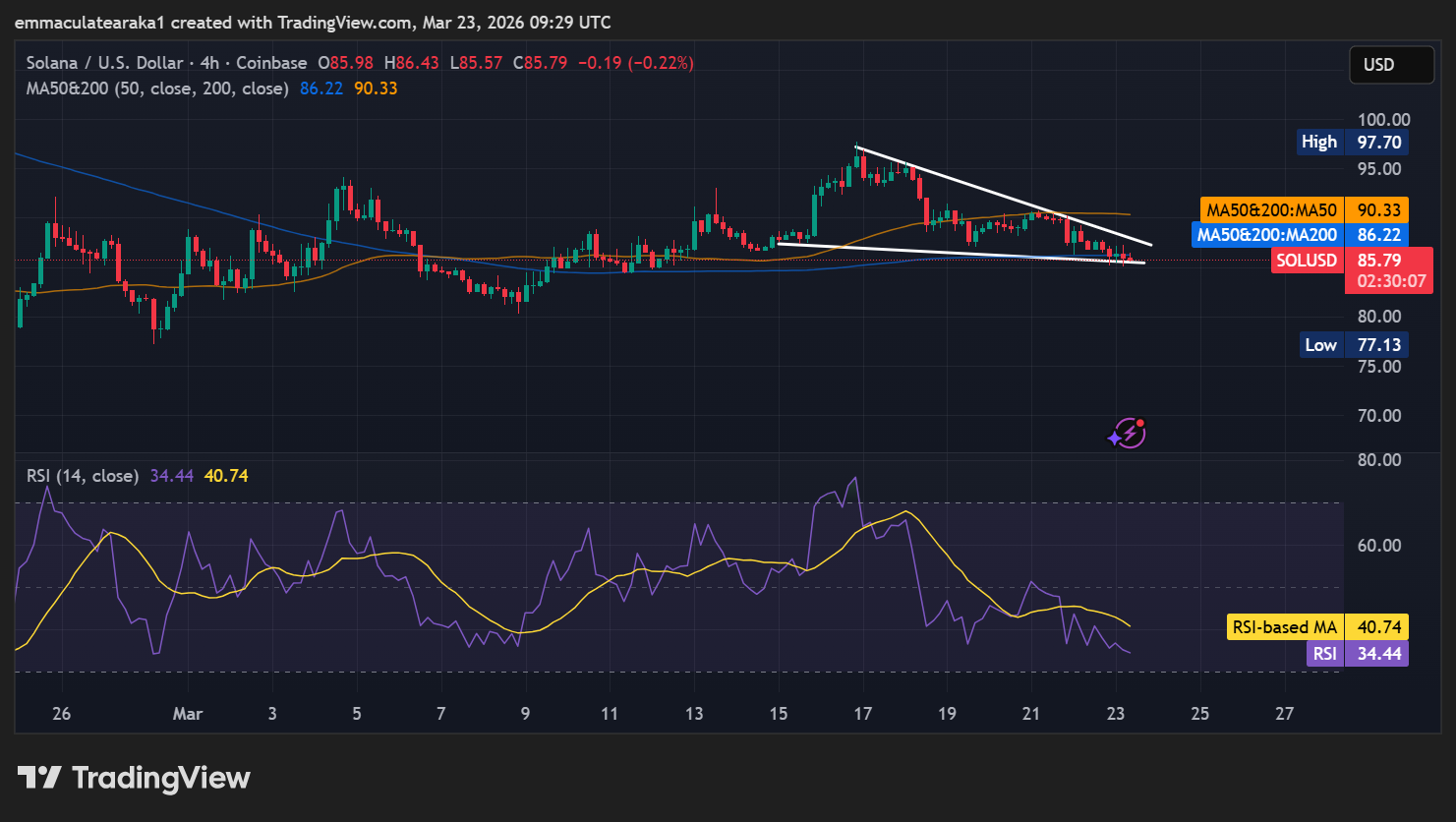 The next major support zone is between $84 and $81 on the chart. This area saw intense buying interest and could attract new buyers if the price stabilizes.​ Above, resistance sits around $86-$90, with the 50-day and 200-day SMAs ready to block any rebounds. If Solana can reclaim this area, a push higher to $91 might be possible. However, the selling pressure remains strong.