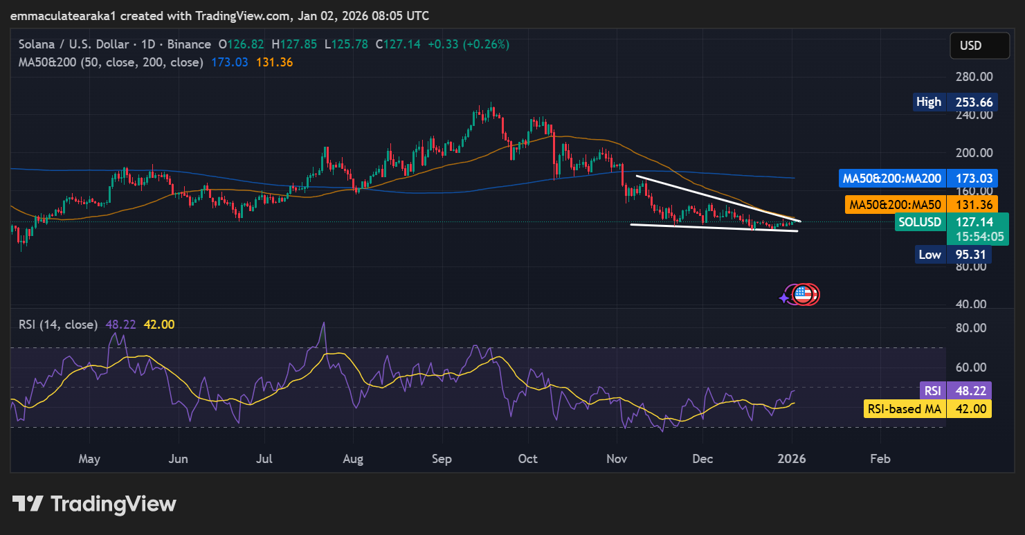 Looking at the Solana price daily chart, SOL has bounced from the $122 zone and is currently trading just above it at $127. The area around $122 is acting as the immediate support, while the next notable resistance is around $131, where the bulls are targeting soon.