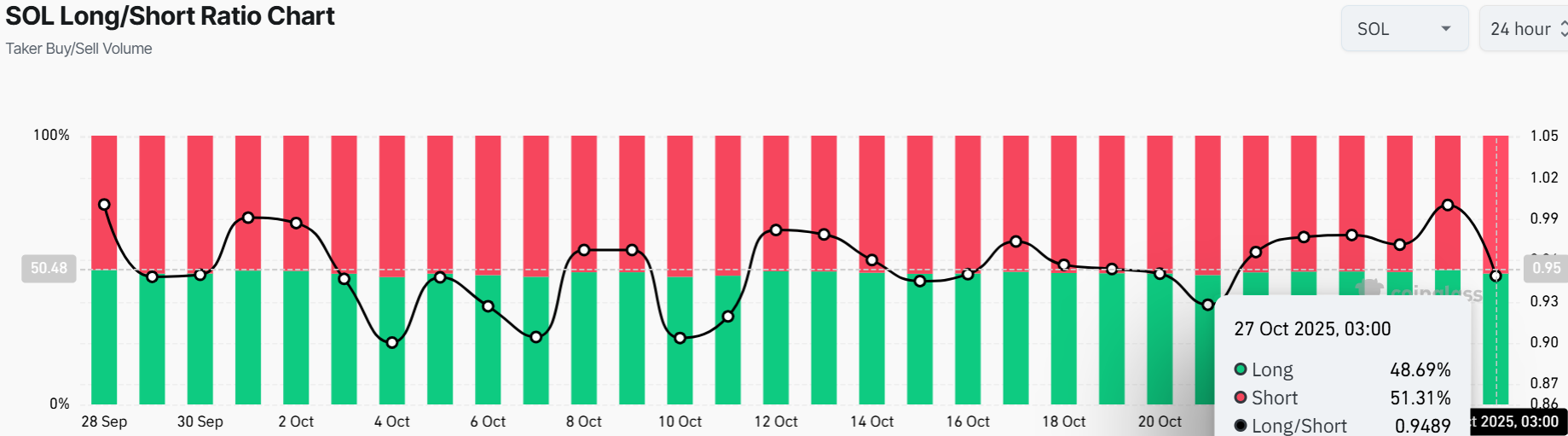 The SOL Long/Short Ratio depicts the short positions slightly exceeding the longs (51.31% to 48.69%). The overall long/short ratio is 0.9489. This minor bearish inclination is a cautious optimism. This is probably because of technical opposition or macro hesitation, but it has not suppressed the overall movement.