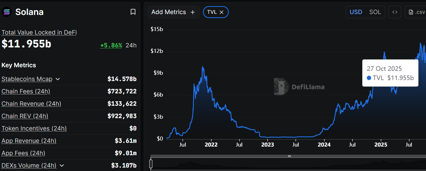 According to the DefiLlama data, the Total Value Locked (TVL) of Solana grew to $11.955 billion on Monday compared to $10.42 billion on October 11. This shows that it is nearing the record high of $13.22 reached on September 14. The increasing TVL is often taken as a sign that the ecosystem of SOL is more active and attractive, and more users are depositing or transacting on it.