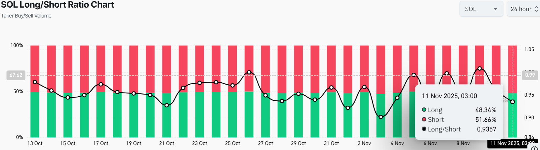 On the other hand, the long/short ratio in the derivatives market is 0.9357, suggesting a slight prevalence of short positions (51.66%) over long positions (48.34%). This indicates that traders are now more willing to bet against Solana’s price movement. The chart also exhibits a cyclical trend, with the long and short positions swinging within a narrow range over the last few weeks. This shows that the market is unsure of Solana’s direction.