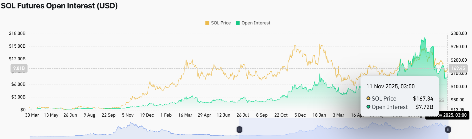 The Solana price has rebounded from the $152 lows, currently exchanging hands at $163 mark. Its daily trading volume is holding strong, spiking 3% indicating renewed investor confidence. The Solana derivatives market has yet to rebound after being liquidated on October 10. About $19 billion of the crypto assets were sold in a single day. The futures Open Interest (OI) stands at an average of $7.72 billion on Tuesday, compared with $10 billion on November 1 and $14.83 billion on October 1, according to CoinGlass data.