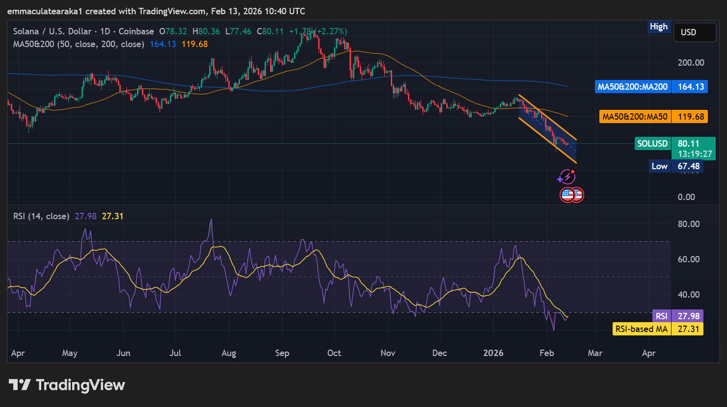 Looking at the SOL/USD 1-day price chart, Solana is holding above the key support at $78, just below the current price of $80. This support zone sits near recent lows at $67 and is watched closely by traders.