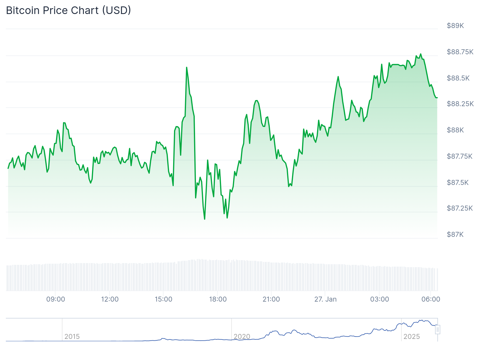 At the time of press, the cryptocurrency market has surged 0.9% in the past 24 hours, with a market cap of $3.074 trillion and a trading volume of $118.268 billion. BTC maintains a dominance of 57.4%, while Ethereum sits at 11.5%. On its part, Bitcoin is up 0.8% and changing hands at approximately $88,310. It has a market cap of roughly $1.76 trillion and a trading volume of $43.64 billion.