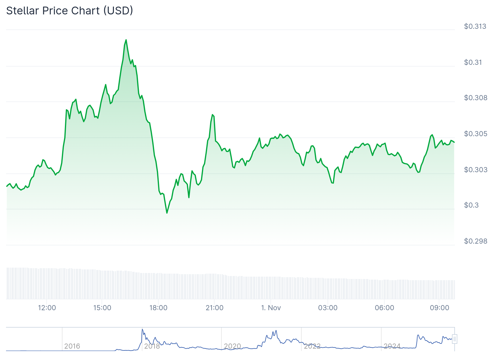 On CoinGecko, Stellar Lumens (XLM) is the twentieth most valuable cryptocurrency with a market cap of $9.76 billion. At the time of press, it is trading at roughly $0.3, following a 1% upswing in the past 24 hours. XLM has a 24-hour trading volume of $245.7 million, with a high supply inflation at 7.98%. Its volatility is very high at 10.11%, while sentiment remains bearish.