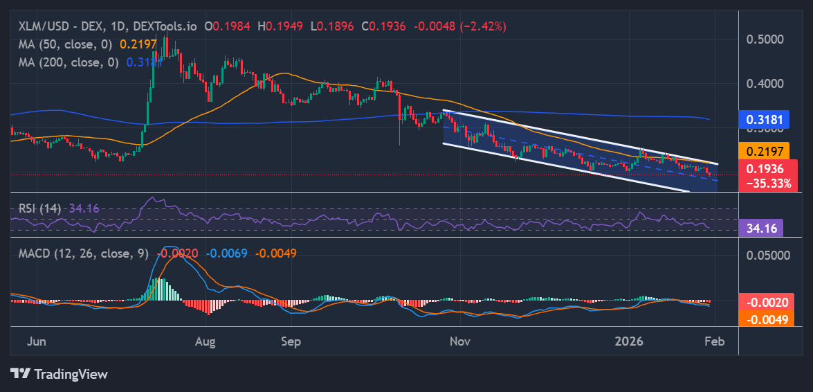The daily XLM/USD chart tells a cautious story, as the bears have the upper hand. The coin has been in a prolonged downtrend within a falling parallel channel. The daily chart shows price currently at $0.19, down nearly 8% over the past seven days and sitting under both the 50-day Simple Moving Average (SMA) at $0.21 and the 200-day SMA at $0.31. These levels are crucial reference points for long-term traders.