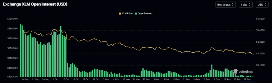 The futures Open Interest (OI) of XLM is down to $106.50 million on Friday and has been continuously decreasing since the high of January 6 at $166.99 million. This decline in OI indicates a significant decline in the participation of investors, and it shows a negative perspective.