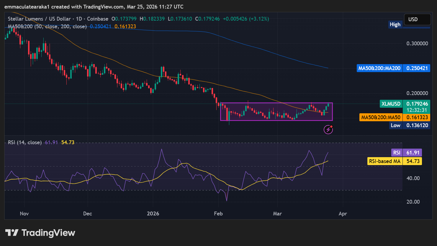 Looking at the daily price chart, XLM price has broken through a key resistance level. The token is currently trading at $0.17, up from recent lows near $0.15 and far above its 50-day simple moving average (SMA) at $0.16.