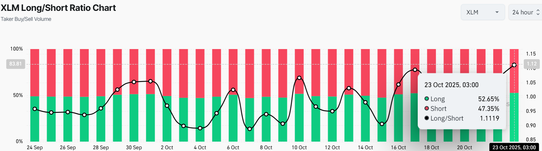 Aside from positive funding rates, bullish bets on Stellar are on the rise among traders. The long-to-short ratio for XLM on Coinglass stood at 1.1119 on Thursday, the highest in 30 days, suggesting a bullish mood.