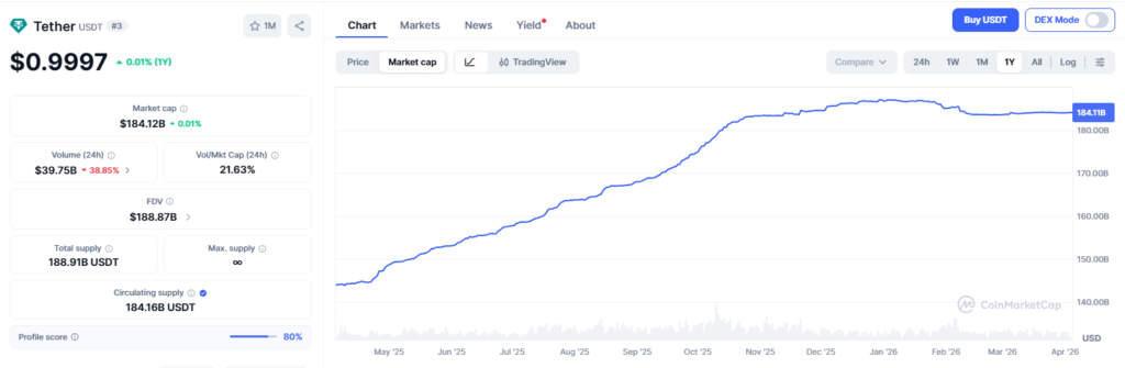 USDT is the largest stablecoin in terms of market value, with a supply of approximately $184 billion. This scale makes the company have a firm grip on crypto trading, cross-border transfers, and access to the dollar in most markets. In addition, its liquidity remains a benchmark for a significant part of the digital asset industry. This advantage assists in justifying investor interest despite valuation issues.