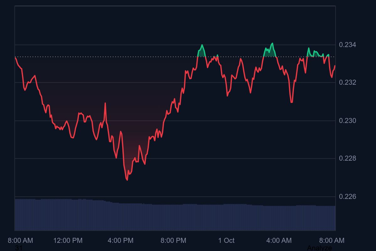 At the time of writing, DOGE is 0.5% up in the past 24 hours, trading at $0.2334. Within the same timeframe, it fluctuated between $0.2269 and $0.234 with trading volume of $1.83 billion. The other extended period price change metrics reflected declines. For context, DOGE dropped 1.4% 7-day-to-date and 11.9% 14-day-to-date. However, it spiked 11.6% month-to-date and 97.2% year-to-date. Meanwhile, supply inflation reflected medium at 3.42%, volatility was high at 9.42%, while dominance was 0.90%.
